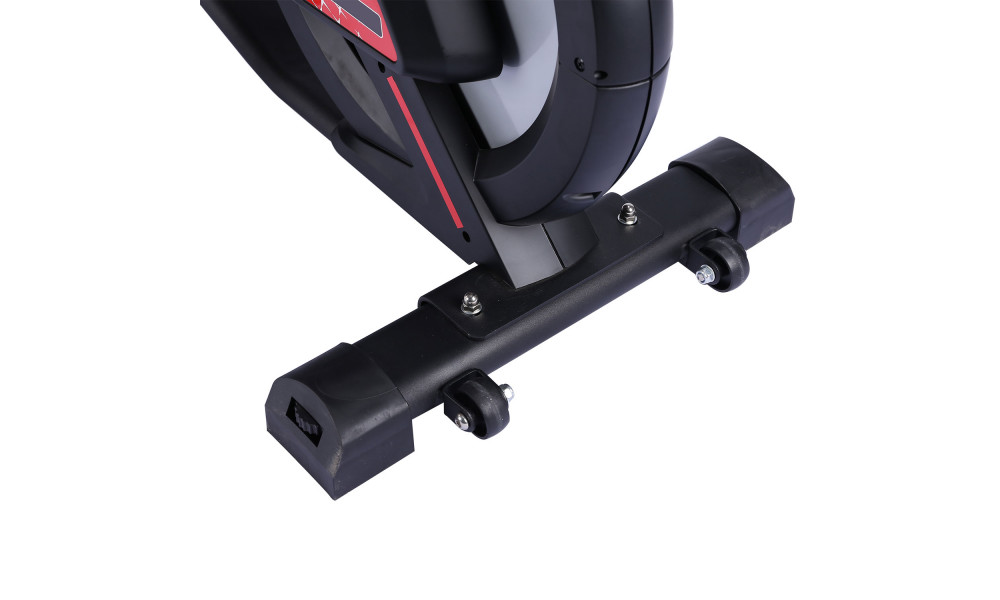 Для перемещения тренажера в помещении установлены колеса. Фиксация ног в педалях с помощью резиновых ремней с регулировкой.